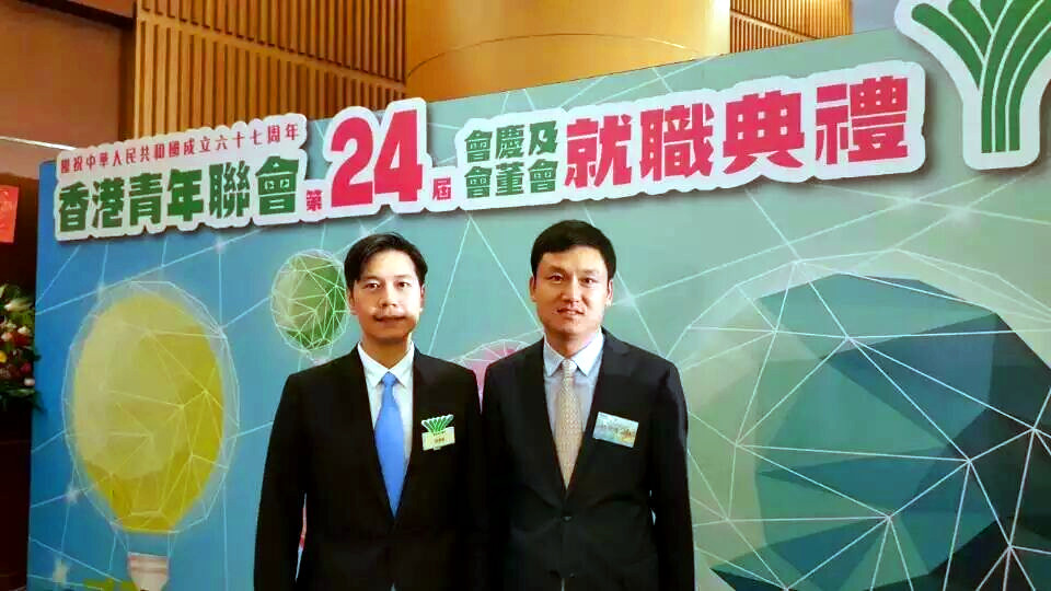 公司董事长徐浩(右一)与香港青年联会新当选主席吴杰庄(左一)合影留念
