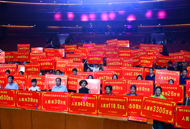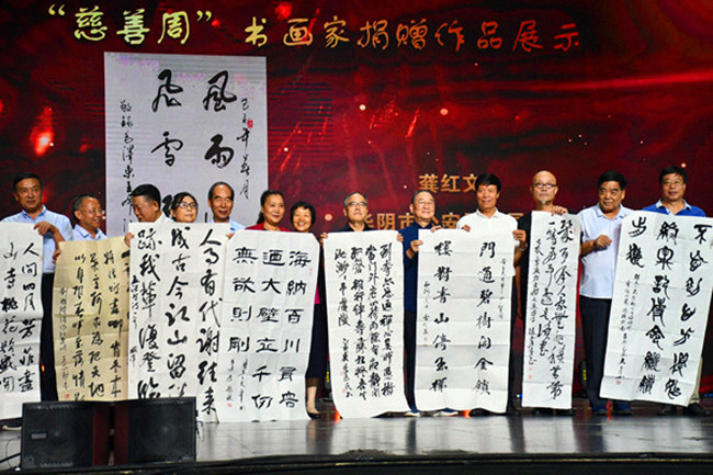 晚会上,省人大副主任郭大为等领导为荣获民政部第十届“中华慈善奖”捐赠个人以及中华慈善总会表彰的全国基层慈善工作者、爱心企业以及爱心企业家佩戴了红花。现场,对8个精准扶贫项目进行了展示和推荐,众多爱心企业、爱心人士现场举牌展示慈善捐赠共6.9334亿元,同时,书画艺术家们向省慈善协会捐赠书画作品。