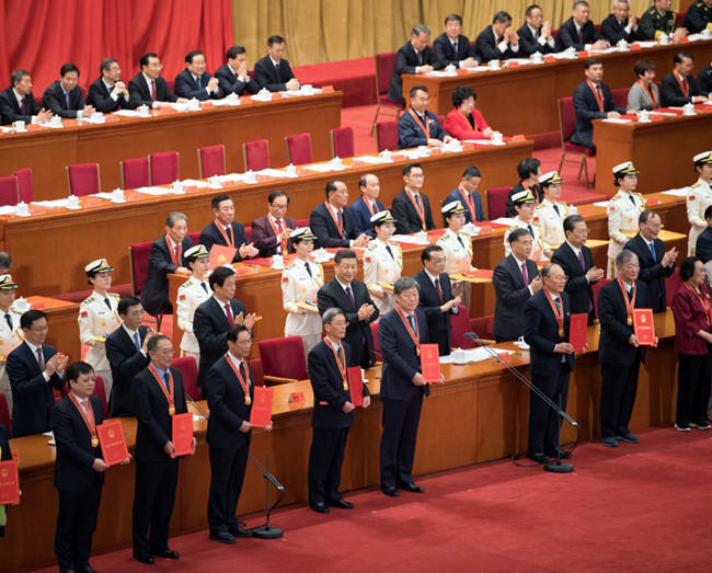 12月18日,庆祝改革开放40周年大会在北京人民大会堂隆重举行。中共中央总书记、国家主席、中央军委主席习近平在大会上发表重要讲话。这是习近平等为获得改革先锋称号人员代表颁奖。(新华社记者燕雁 摄)