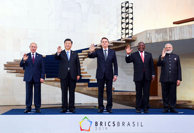 当地时间11月14日,金砖国家领导人第十一次会晤在巴西首都巴西利亚举行。巴西总统博索纳罗主持会晤。中国国家主席习近平、俄罗斯总统普京、印度总理莫迪、南非总统拉马福萨出席。习近平发表题为《携手努力共谱合作新篇章》的重要讲话。新华社记者 李学仁 摄